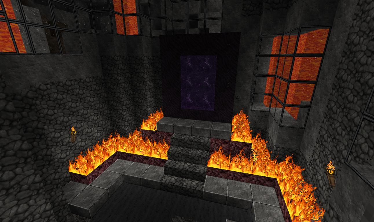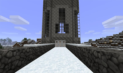 This time I decided to just put 4 waterfalls of lava round each side instead of filling the whole outside with it, the other reason being that some time after i'd taken the shots I created a minecart track around the outside of the fortress because I had actually blown right through and exposed one of my underground mine shafts. With the tower being alot taller (and wider to some degree) I had to almost the amount of rooms inside so apart from the usual rooms I had before, I decided to have an 'elements' theme to the rest of them.
